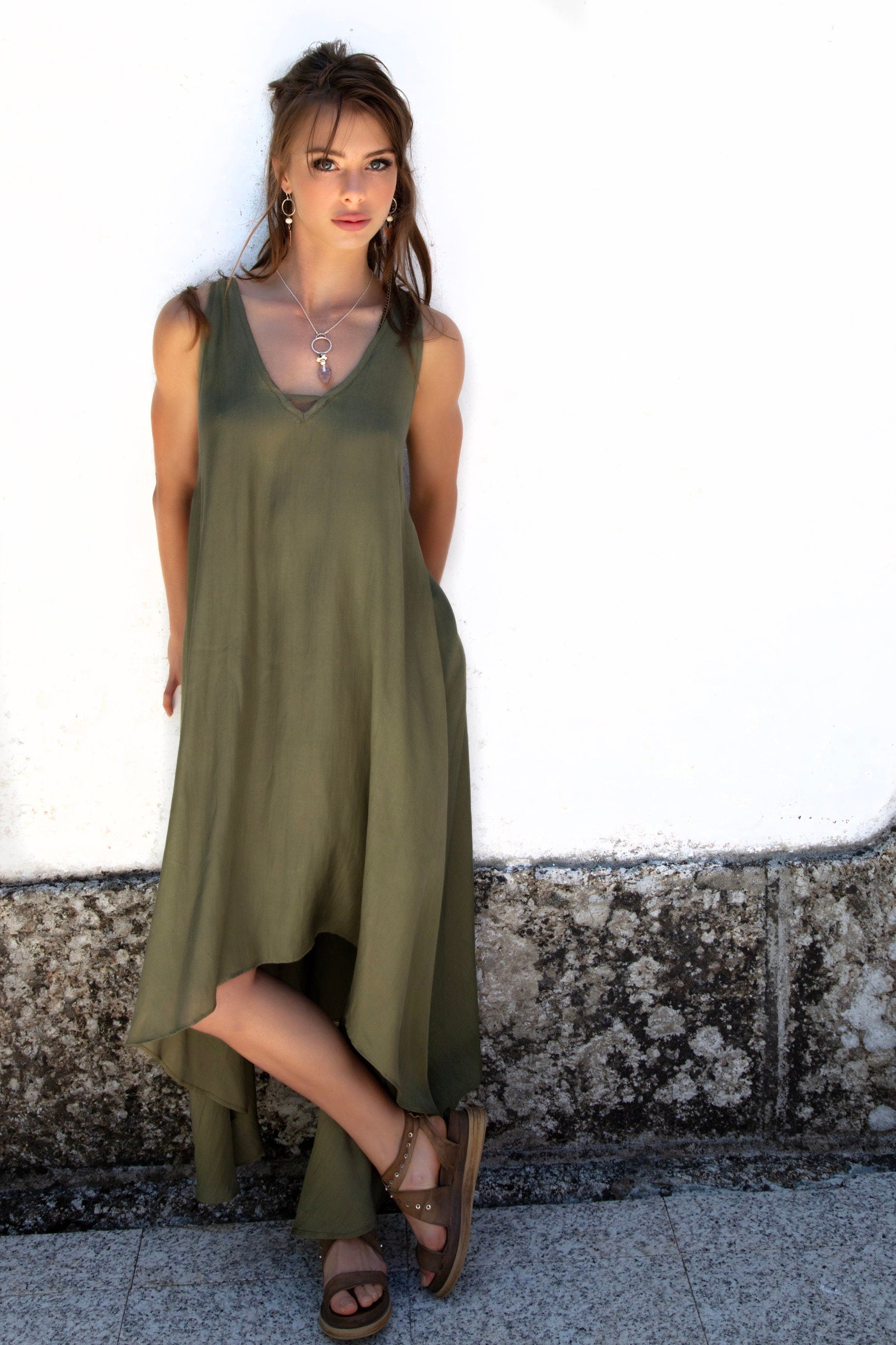 Saraswati beautiful boho summer dress is made from pure organic soya fabric and dyed to a beautiful shade of dark olive forest green. The feel of this fabric is simply divine…..so light, soft and delicate but at the same time strong. It feels amazing to wear and falls so beautifully, just like silk. The fabric is handloomed into a delicate herringbone.