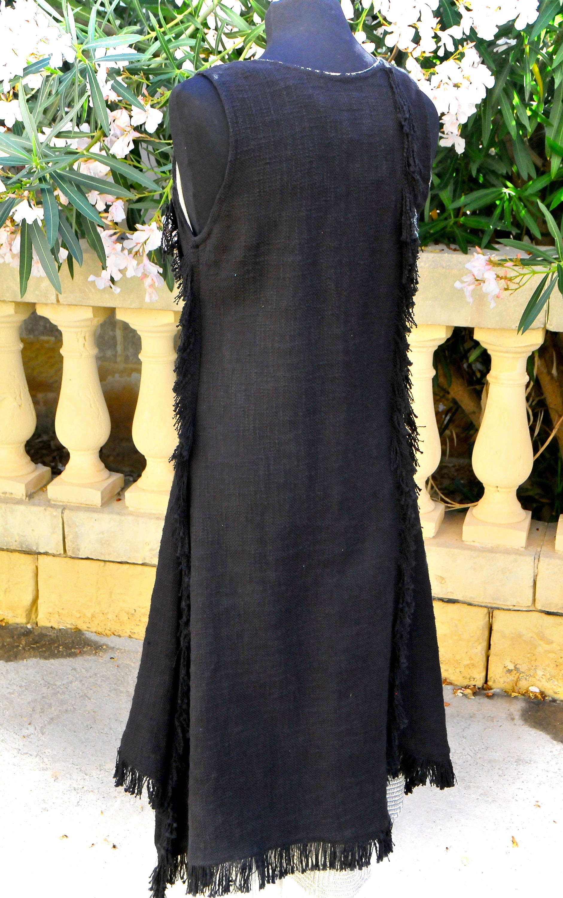 Long Boho Vest, Sleeveless long vest, Long linen vest, Long fringed Vest, Black Long duster vest, LLAGATHA EBONY