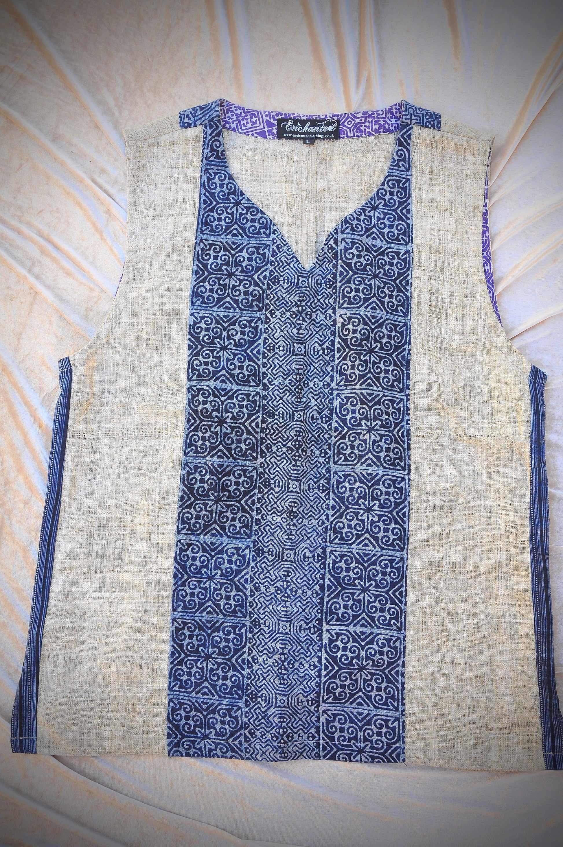 This Design Features cream hemp with stunning sea blue block print on cotton cotton detailing.