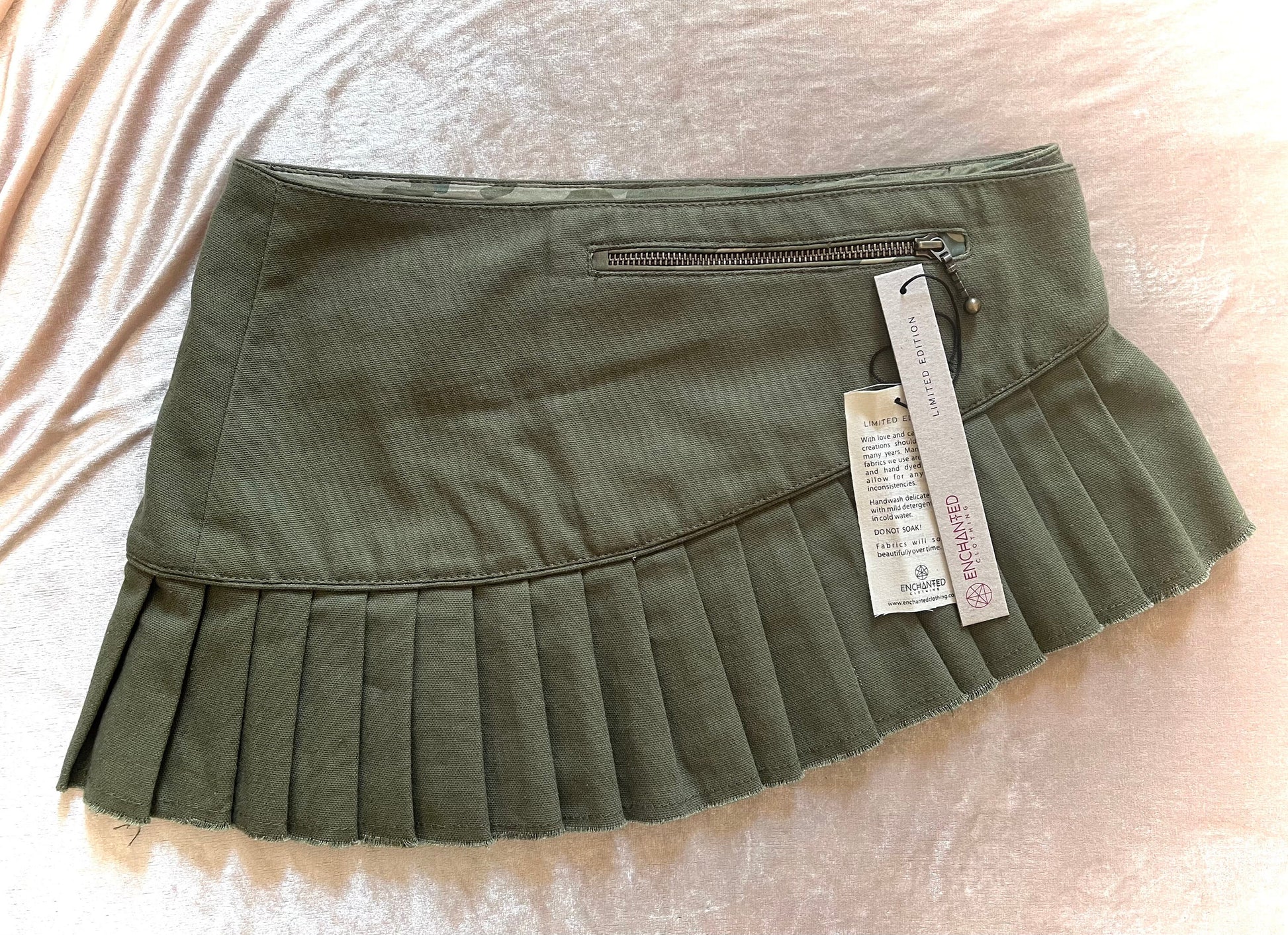 Enchanting LILITH pleated mini in soft sage strong canvas with an attractive feature buckle and Frayed bottom edge. Long back zip pocket into which you can slip some cash, keys or a phone if it's not too large. We've added some contrast piping around the pockets too.