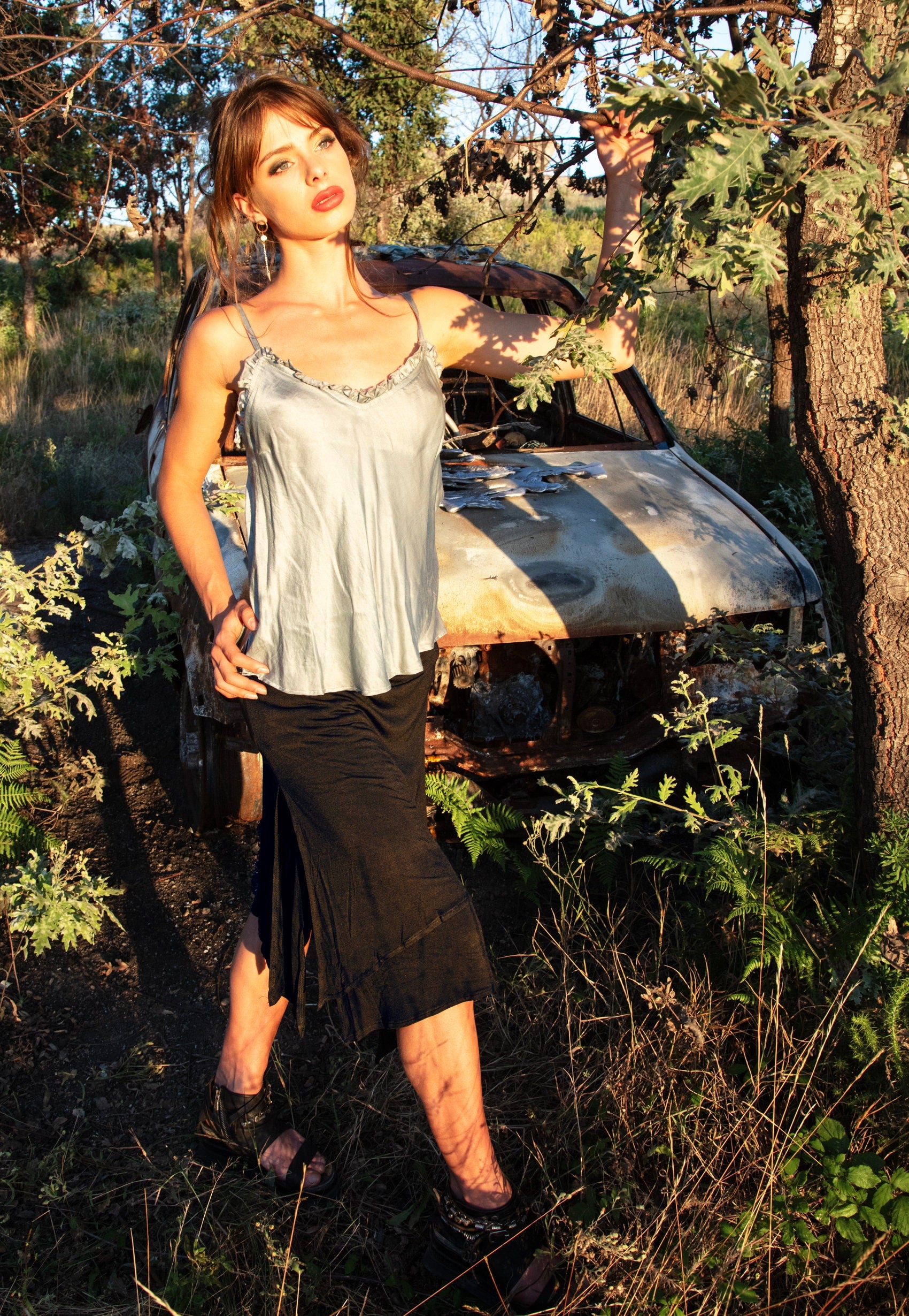 The colour is a deep Brazil nut brown and the skirt has two layers with high splits for a unique look that flows effortlessly as you walk.