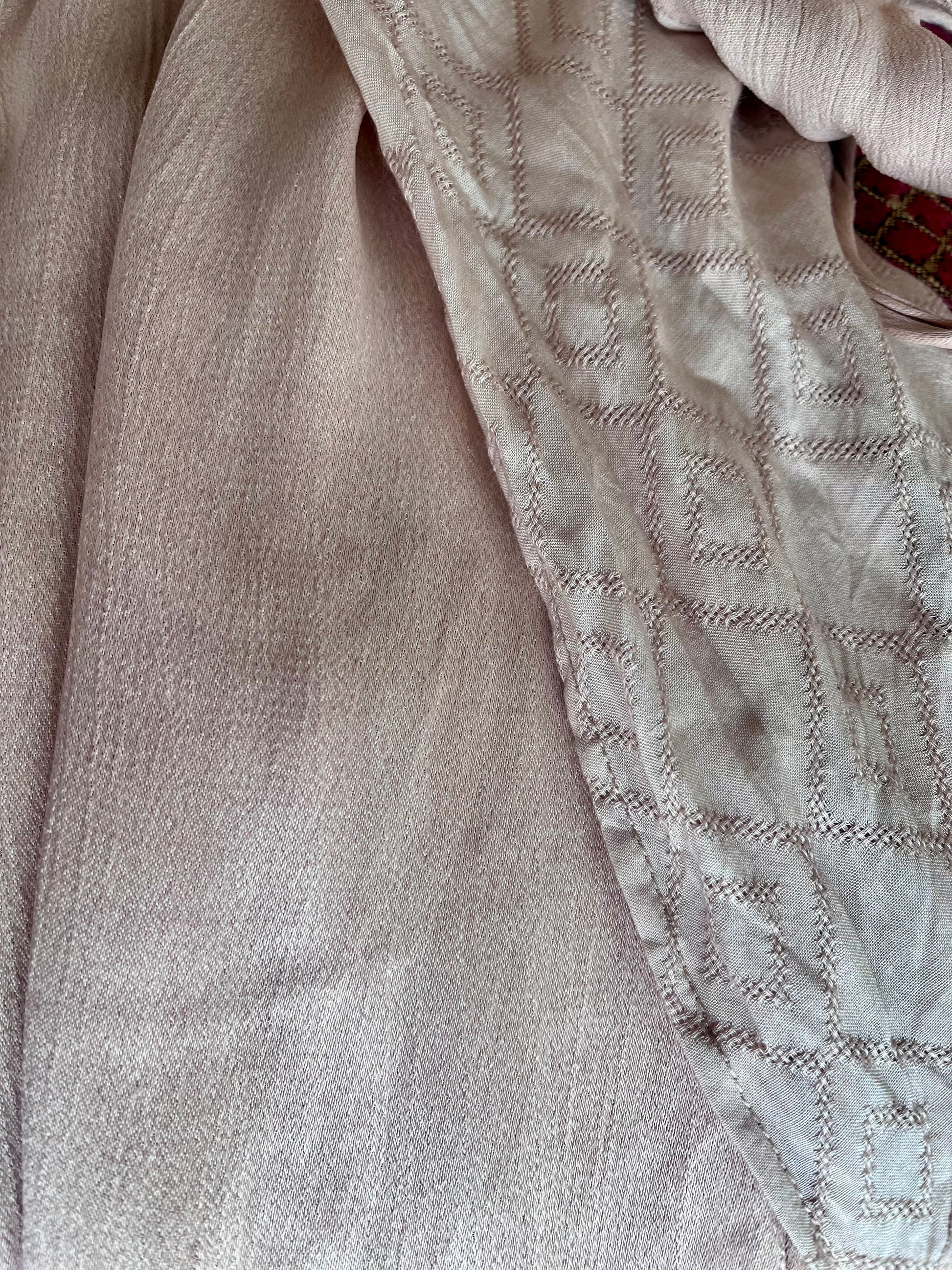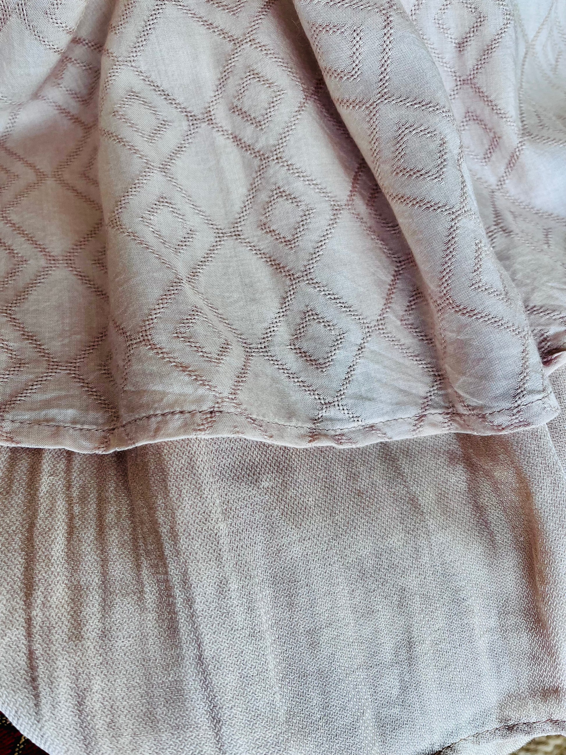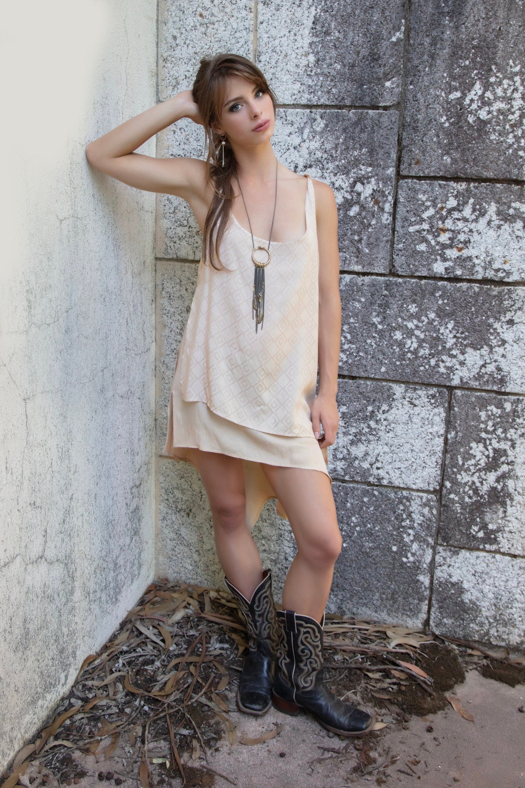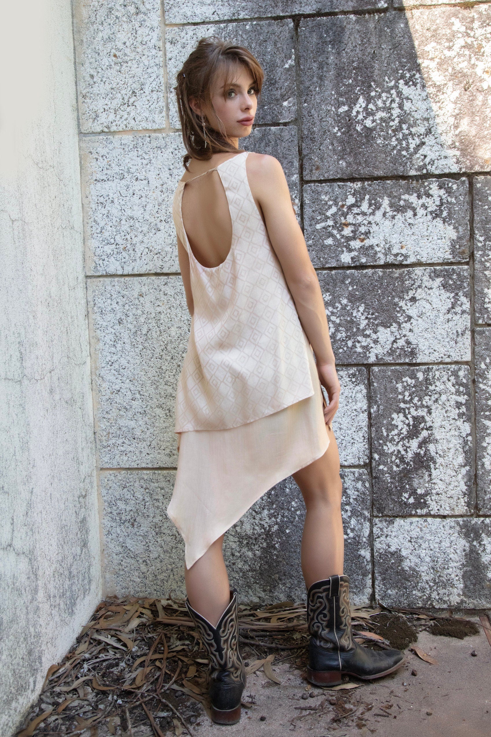 This version of the IDUNN two layered asymmetrical dress is a combination of two different organic fabrics. The underside is made of silky soft organic soya hulls handloomed in a delicate Herringbone weave. The top layer is featherlight aloe Vera woven into delicate diamonds.